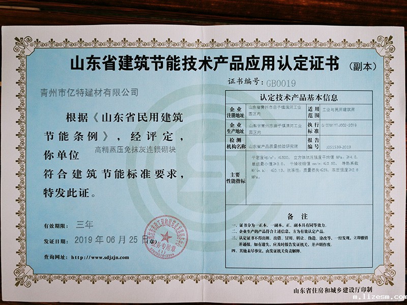 山东省建筑节能技术产品应用认定证书